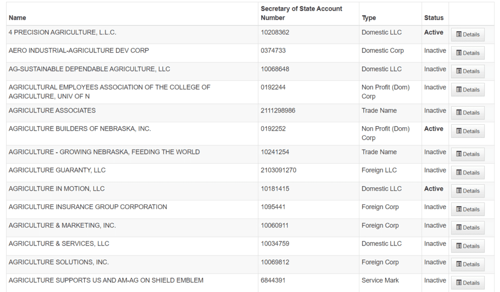 A business search facility is available on the Nebraska Government website which is provided by the Nebraska Secretary of State. Their Corporate & Business Search facility provides a database of businesses that have been registered in Nebraska and key information about those businesses that is publicly available. You can search the Corporate & Business Search database by: